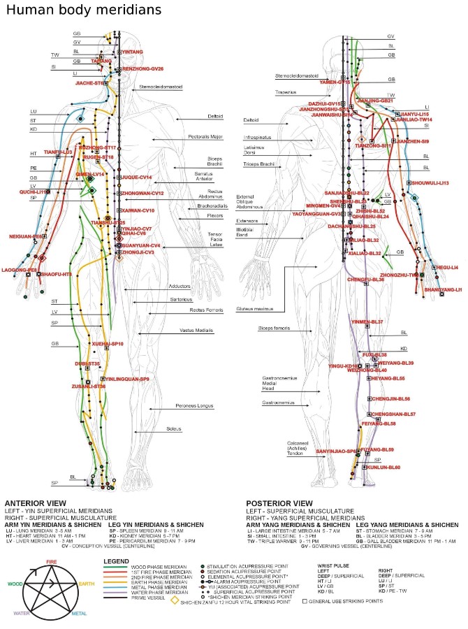 Le Chi circule à la surface et a l'intérieur du corps le long d'une série de canaux interreliés, identifiés il y a plusieurs siècle par la médecine traditionnelle Chinoise.